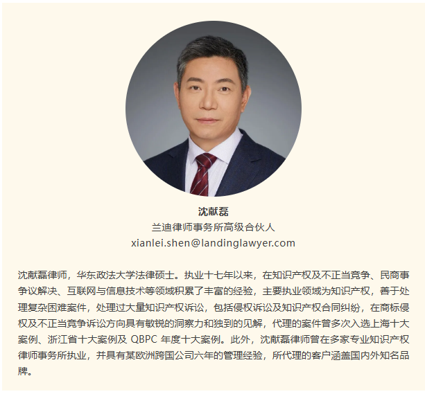 沈献磊律师现任兰迪律师事务所高级合伙人,长期专注于知识产权法律服务,尤其在商标权保护领域具有深厚造诣和广泛影响力。执业近二十年来,他始终立足商标确权、维权与战略管理前沿,以专业能力推动司法实践创新,以行业担当促进知识产权生态完善,成为商标法律服务领域的标杆型律师。他在多起重大、复杂商标侵权及不正当竞争案件中实现突破性胜诉,尤其在应对恶意抢注、商标代理机构滥用权利等疑难问题上,开创了具有示范意义的维权路径,有力推动了相关法律规则的明晰与适用。其代理案件多次入选上海市、浙江省十大知识产权典型案例及QBPC年度十大典型案例,充分体现了对其专业水准与案件影响力的高度认可。同时,沈献磊律师始终坚持以企业品牌战略为核心,将法律维权与商业目标深度融合,不仅精准打击侵权行为,更注重构建系统化、可持续的品牌保护体系,为众多国内外知名企业提供全链条、高价值的商标法律服务。他善于从个案中提炼规则,从实践中升华理论,持续在“知产π”等专业平台发表深度实务文章,聚焦行业难点,引领专业讨论。此外,作为上海政法学院、江苏师范大学法学院校外导师,他积极投身法治人才培养,推动知识产权理论与实务的双向赋能。沈献磊律师以其出色的实务成就、系统的专业思考和对行业进步的持续贡献,生动诠释了知识产权律师在服务创新、守护品牌价值中的核心作用,为商标法治建设与品牌高质量发展提供了坚实有力的专业支撑。