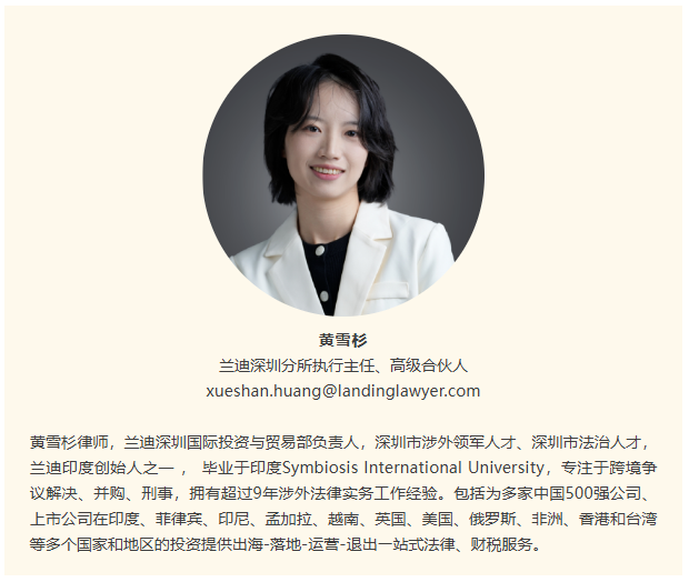 黄雪杉律师,兰迪律师事务所深圳分所执行主任、国际投资与贸易部负责人、兰迪印度创始人之一。执业以来她始终专注于涉外法律投资事务,为多家500强企业、上市公司在印度、孟加拉国、巴基斯坦、印度尼西亚、泰国、马来西亚、巴西、墨西哥等南亚、东南亚、拉美国家和地区的投资提供“出海-落地-运营-退出”一站式法律、财税服务。黄雪杉律师参与创办了印度首家由华人主导的律师事务所,并构建了高效的“中印双律师协同机制”,切实解决了境外法律服务市场的信息不对称与信任难题。在此期间,她凭借扎实的实务能力在股权并购、税务争议、破产案件及仲裁裁决跨境执行等高端复杂领域屡创佳绩,多次为客户避免或挽回巨额损失。黄雪杉律师善于在谈判中坚守客户核心利益,亦能在危机中为企业厘清迷局、提供清晰路径。例如在“上市国企印度股权跨境转让”项目中,黄雪杉律师主导设计了横跨中印法域的复杂交易结构,在高压的多轮并行谈判中,她始终坚守客户权益,最终助力客户顺利完成逾亿元的重大资产处置,并提前收回数千万借款。业务之余,黄雪杉律师持续将实务经验凝练成《金砖国家法律研究》《漫谈印度投资》等研究成果,并通过专业媒体发声,持续为出海企业赋能。从适应异国环境到建立本土化团队,从服务单一项目到构建平台化生态,黄雪杉律师以其前瞻的布局、不懈的耕耘与真挚的使命感,生动诠释了一位新时代出海服务律师的价值与担当。
