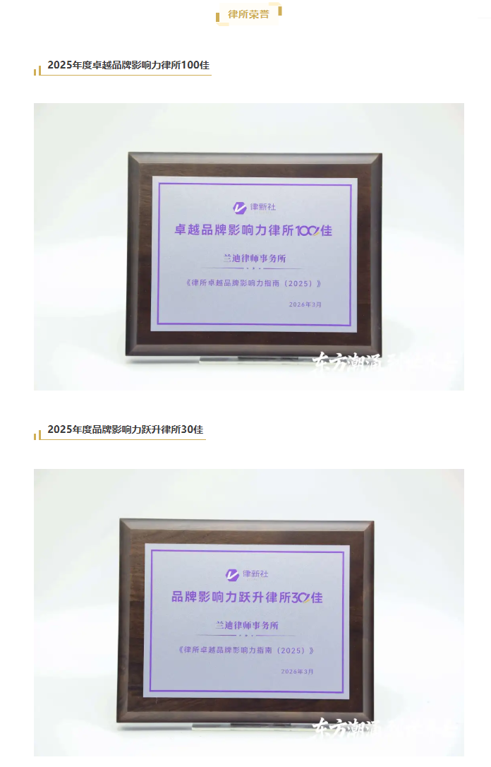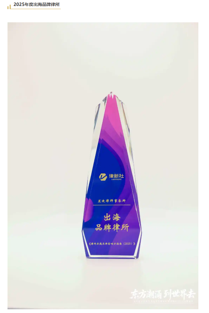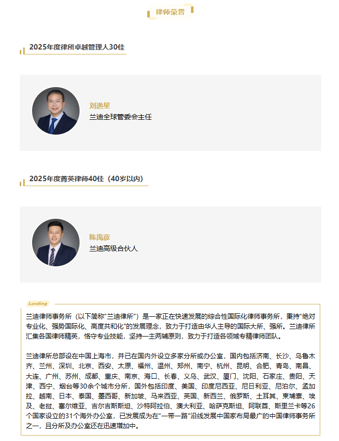 兰迪律师事务所凭借卓越的品牌影响力以及在涉外法律服务领域的专业能力,荣获“2025年度卓越品牌影响力律所100佳”“2025年度品牌影响力跃升律所30佳”“2025年度出海品牌律所”。兰迪律师事务所全球管委会主任刘逸星律师荣获“2025年度律所卓越管理人30佳”,高级合伙人陈禹彦律师荣获“2025年度菁英律师40佳(40岁以内)”。