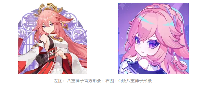在目前的商业环境中,对虚拟角色形象进行大刀阔斧地修改,甚至删去一些标志性特征进行二次创作的情况屡见不鲜。而同人二创中,各个创作者的风格迥异,对五官、体型的把握也不尽相同。在不同创作要求下,创作的作品也天然存在较大区别的可能性,例如对原作品进行Q版再创作。链接不同形象之间的并非色彩、线条等视觉要素,反而可能是需要结合姓名、口头禅、经典动作形象进行识别。例如下图中左侧为《原神》游戏中官方设定的八重神子形象,右侧为和抖音联动的Q版八重神子形象。二者之间例如五官、比例的整体形象、人物整体视觉效果存在显著差别,乃至于关键识别的配饰都已经被去除,颜色也发生了调整。如果不与名称或者非视觉元素相结合将很难识别,权利人进行维权的难度将会大大增加。