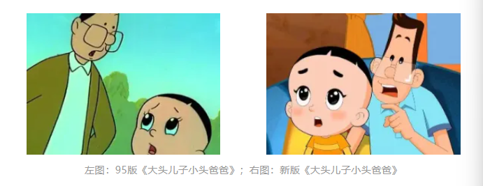 其一,二者在观感上的差异程度不同。下图左侧为95版《大头儿子与小头爸爸》的动画形象(原稿作品已遗失),右侧为新版形象。95版与新版角色在五官比例(如眼睛、嘴巴、眉毛)、体型结构(如头部与身体的比例关系)、动画风格(如线条粗细与色彩饱和度)等方面存在实质性变化。