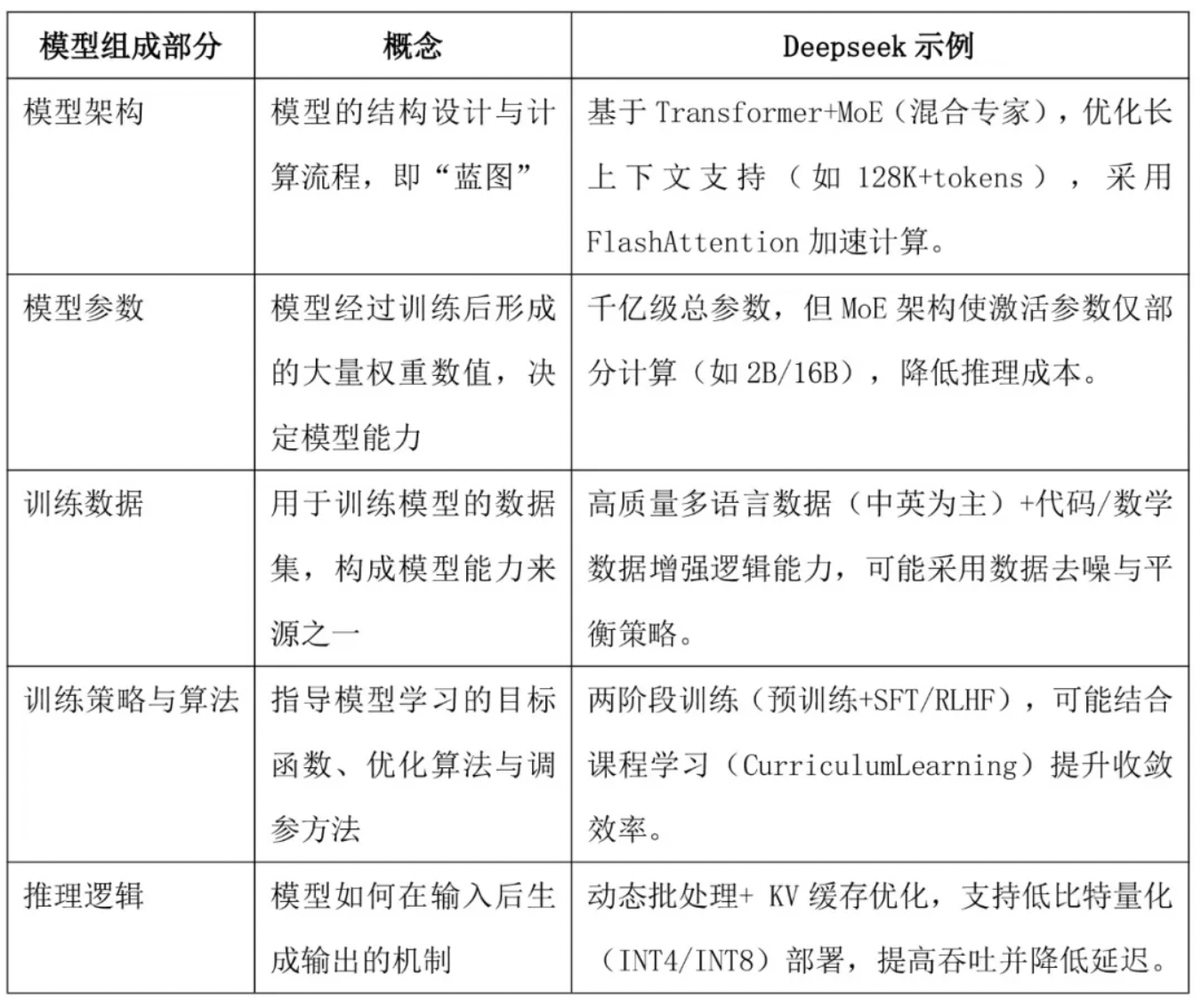 关于这个问题,我们先听听大模型自己的看法。综合ChatGPT与Deepseek的观点,大模型是基于深度学习架构,通过千亿级参数、海量多模态数据与分布式训练技术构建的通用基础模型。其核心特征包括规模依赖性、涌现能力和任务自适应,并依赖预训练-微调范式、对齐技术和高效推理框架,其由多个核心要素共同构成,包括模型架构、模型参数、训练数据、训练策略与算法、推理逻辑等技术实体。