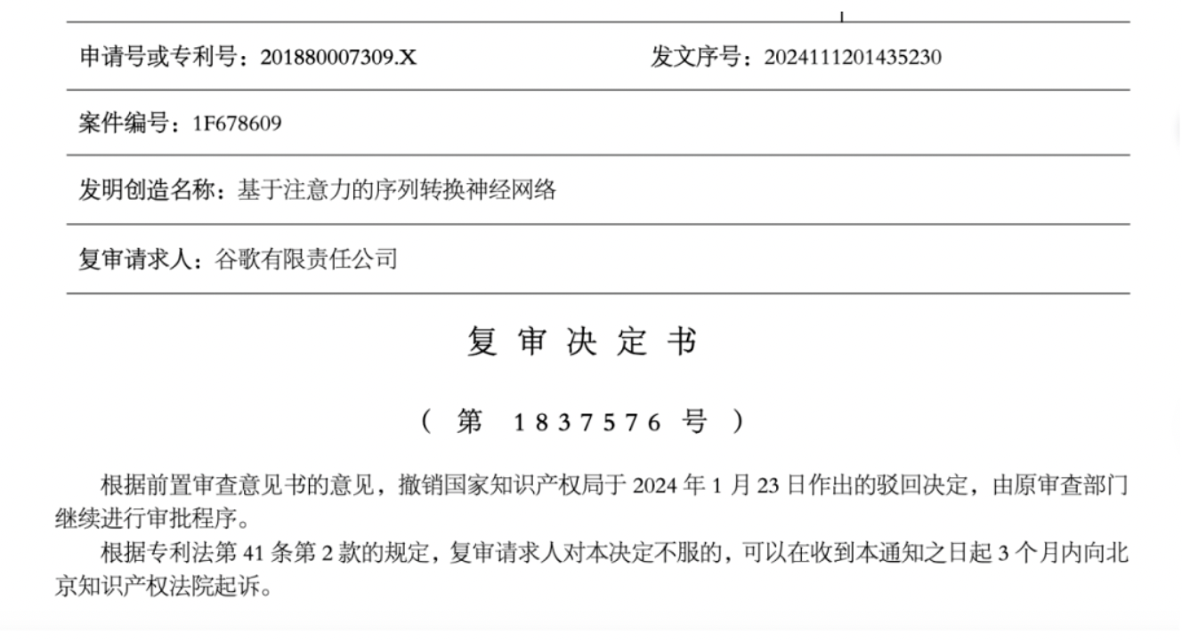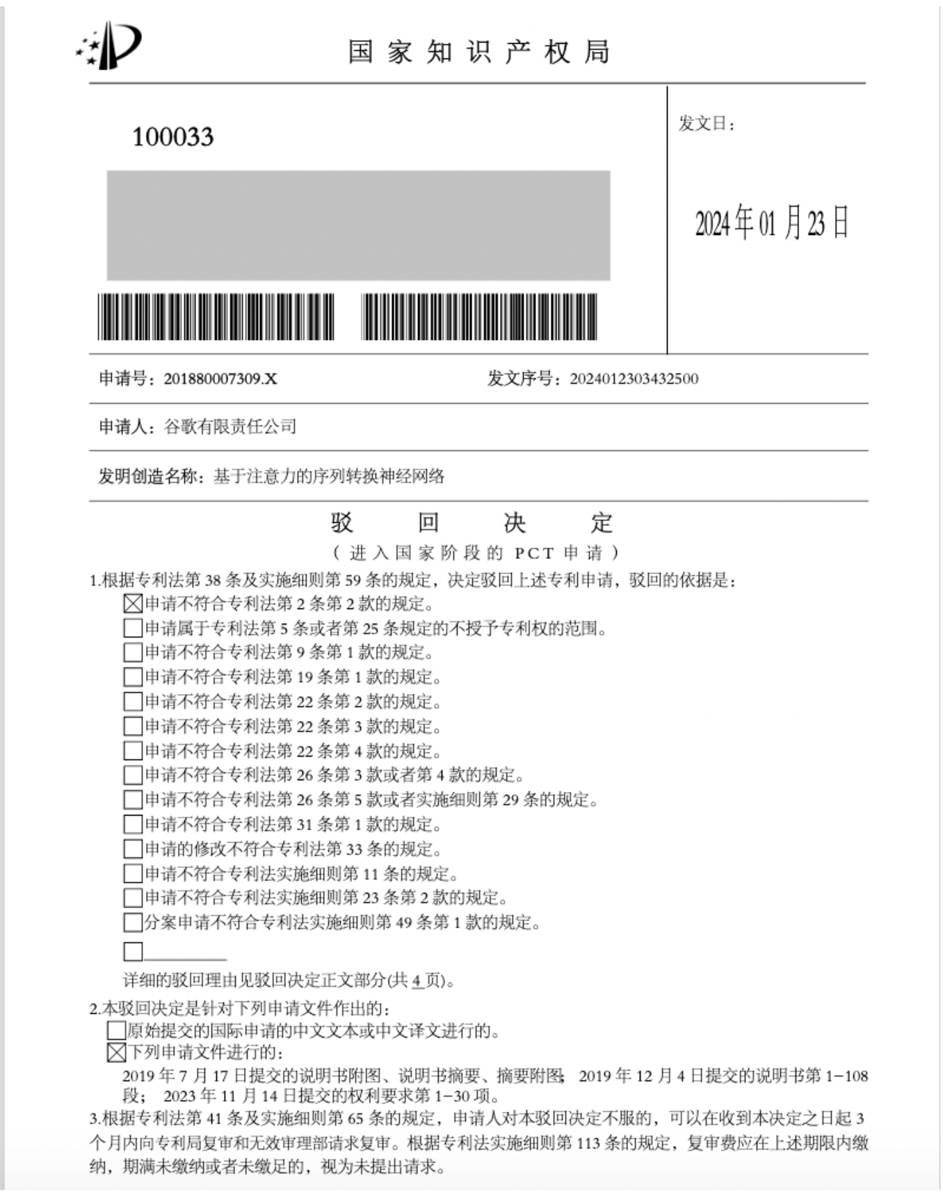 2024年1月23日,国家知识产权局以技术方案不符合专利法第2条第2款(即该技术方案并非专利法所保护的客体)为由驳回了该专利申请。审查员认为,该专利属于对神经网络算法的改进,未解决具体技术领域的技术问题,且未展示如何通过改进提升硬件运算效率或执行效果。随后,谷歌于2024年4月提出复审请求,案件进入复审程序。