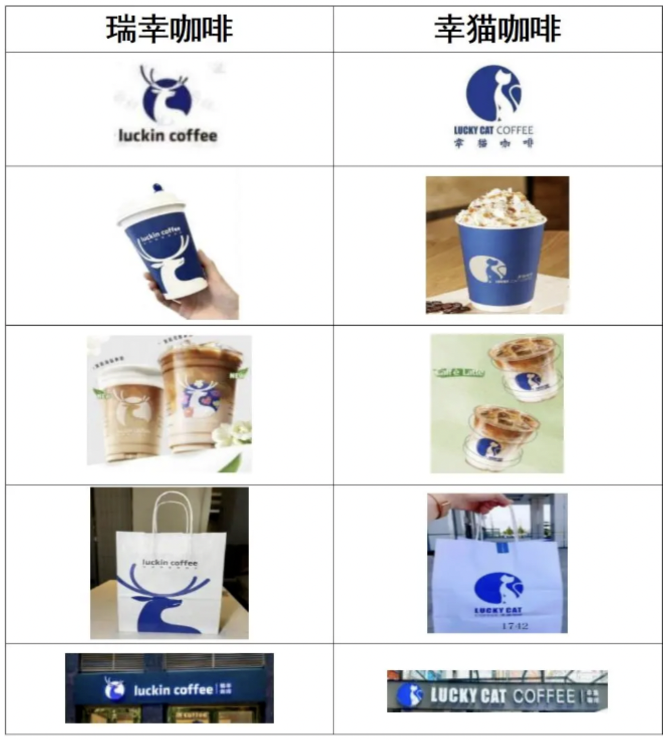 具体情况可结合下图看出,“幸猫咖啡”与“瑞幸咖啡”所销售的热饮咖啡杯壁底色均为蓝色,带有撞色的动物剪影,颜色搭配相同;冷饮咖啡中饮品颜色相同,杯壁中间均为圆形商标带有剪影动物图像,大小相同,占杯身的比例也相同;手提袋均是白底蓝图,色彩搭配相同,均有英文标识;门店招牌的设置相同,左边均是圆形商标,蓝白色彩搭配瞭望形态的动物剪影,右边均是英文商标,“luckycat”“coffee”之间的间隔大小与“luckin”“coffee”之间的间隔大小相同。综合“幸猫咖啡”商标的使用场景与商业外观,普通消费者极易对其所销售的商品来源产生混淆误认,因此,“幸猫咖啡”与“瑞幸咖啡”商标构成近似。