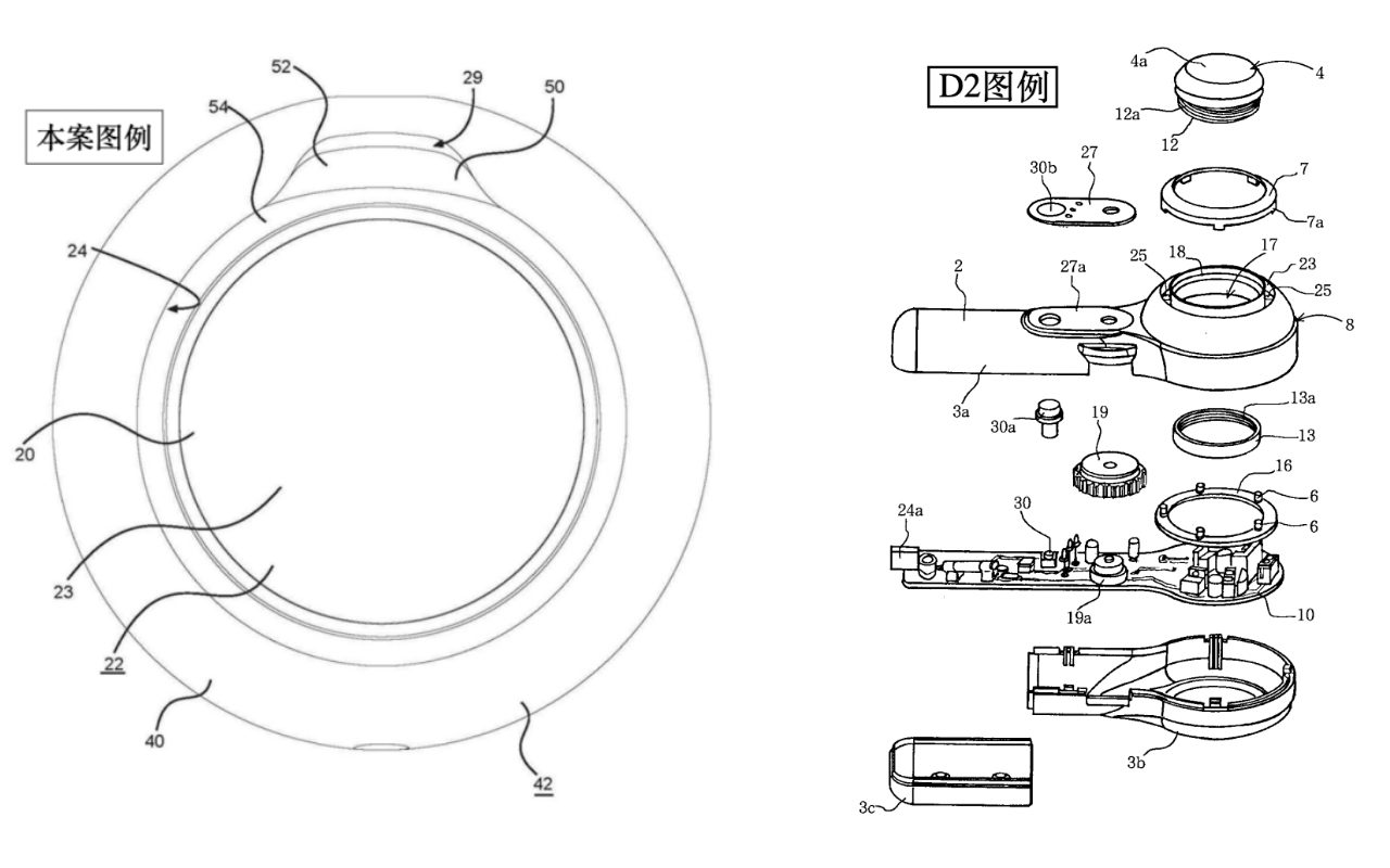 最终,审查员支持了专利权人的抗辩,审查员认为“证据2虽然公开了周向槽23和透明盖7,结合附图1-4可知,周向槽23中设有红外发光灯6,其发出的光可经透明盖7射出,即便认可周向槽对应于本专利的凹槽,但周向槽仅仅起到引导光线的作用,透明盖的作用仅在于透光,透明盖并非一个可拆卸的锁定机构,因此,透明盖不能等同于本专利的可拆卸的锁定机构,周向槽也无需设计为与可拆卸的锁定机构嵌入配合的槽结构。因此,证据2并未给出采用凹槽结构设置形式为可拆卸锁定机构提供安装位置的同时,保证美容仪的光照治疗效果的相关启示。基于证据2公开的内容,本领域技术人员至多想到利用周向槽及其上方的透明盖构造出光通道,引导光线透射至皮肤、实现光治疗,即通过周向槽和透明盖实现光线引导的单个功效,但没有动机将证据 2 中的透明盖设计为能将面膜等美容配件反复可拆卸锁定的可拆卸的锁定机构,将传递光源的凹槽同时设计为与可拆卸锁定机构相适配实现锁定的结构,得到同时设置出光通道和将面膜等美容配件进行锁定的两功效的凹槽结构。因此,在证据1引导光透射的透明盖与供压紧环嵌入的凹槽是两个不同构造的基础上,在证据2给出的利用周向槽及其上方的透明盖构造出光通道,引导光线透射至皮肤实现光治疗的启示下,本领域技术人员难以想到将证据1引导光透射的透明盖与供压紧环嵌入的凹槽这两个部件改造为一个部件,将供压紧环嵌入的凹槽改进为既可实现光线引导又可配合可拆卸锁定结构的凹槽结构,即通过同一套凹槽结构和锁定机构一体实现光线引导和锁定配合两功能”。