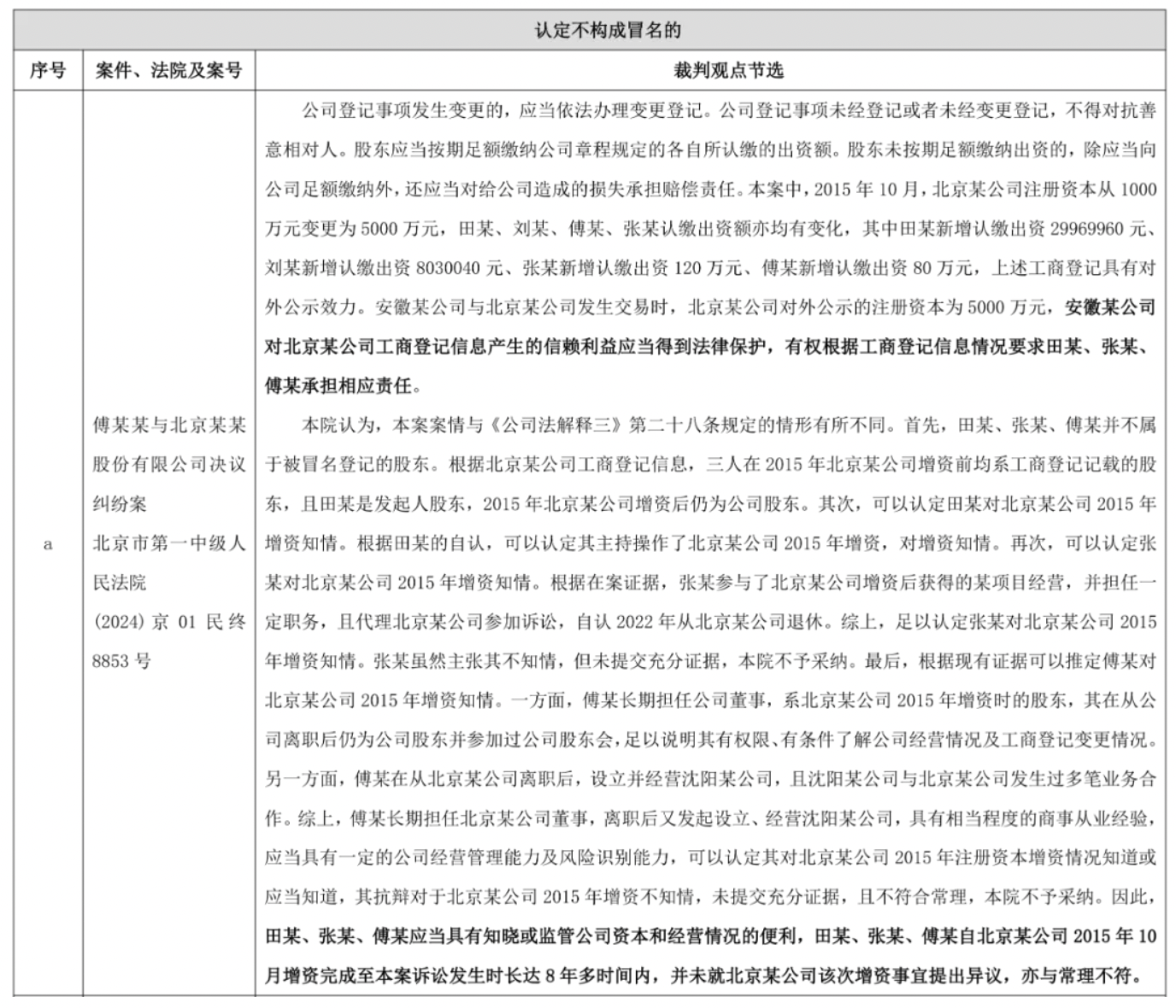 具体而言,法院将结合多方面因素综合判断:一是被登记股东是否实际知晓增资事宜及自身股东身份被用于增资登记;二是冒名者持有被登记股东身份材料是否具有合理解释;三是双方是否存在股权代持、亲属关联、业务合作等利益牵连关系;四是被登记股东是否存在参与公司经营、获取分红、事后追认等可推定其知情的行为。仅有签字非本人签署的鉴定结论,不足以单独成立冒名增资的认定。