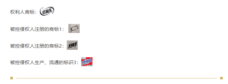 被控侵权人注册的单个商标,往往是权利人具有一定影响的商业标识的核心要素拆分。例如权利人的“优酸乳”是乳饮类知名标识,被控侵权人便注册“商标中文字部分“尤、鲜、孚”。