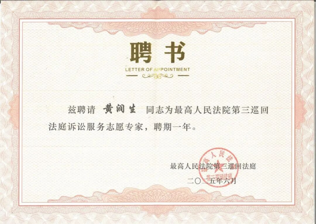 Being appointed as a Volunteer Expert for the Supreme People’s Court is not only an honor but also a solemn responsibility. In the future, Lawyer Huang will fully leverage his professional expertise to actively participate in the court’s volunteer service work—providing legal consultations to petitioners, assisting in resolving conflicts, maintaining social stability, and promoting the spirit of the rule of law.