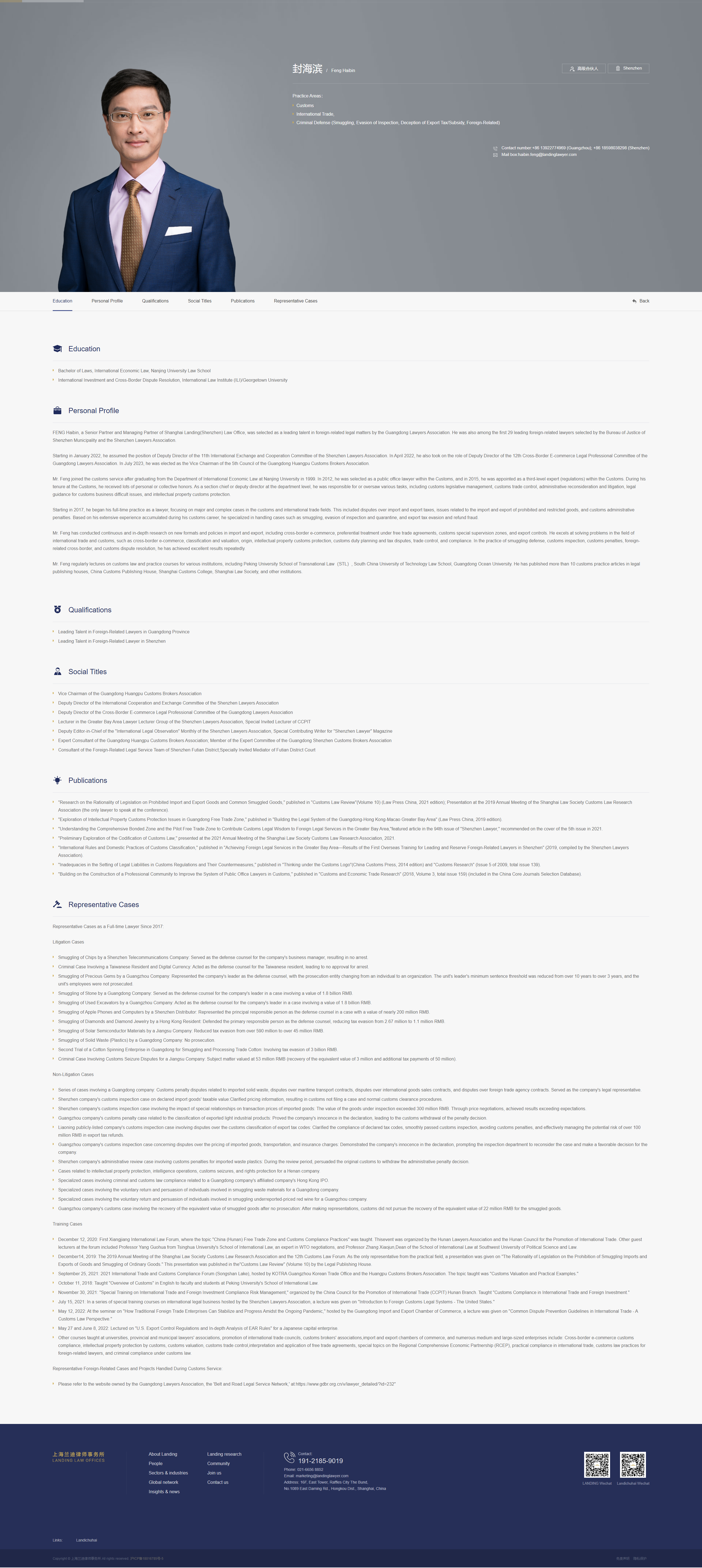 Personal Profile FENG Haibin, a Senior Partner and Managing Partner of Shanghai Landing(Shenzhen) Law Office, was selected as a leading talent in foreign-related legal matters by the Guangdong Lawyers Association. He was also among the first 29 leading foreign-related lawyers selected by the Bureau of Justice of Shenzhen Municipality and the Shenzhen Lawyers Association.