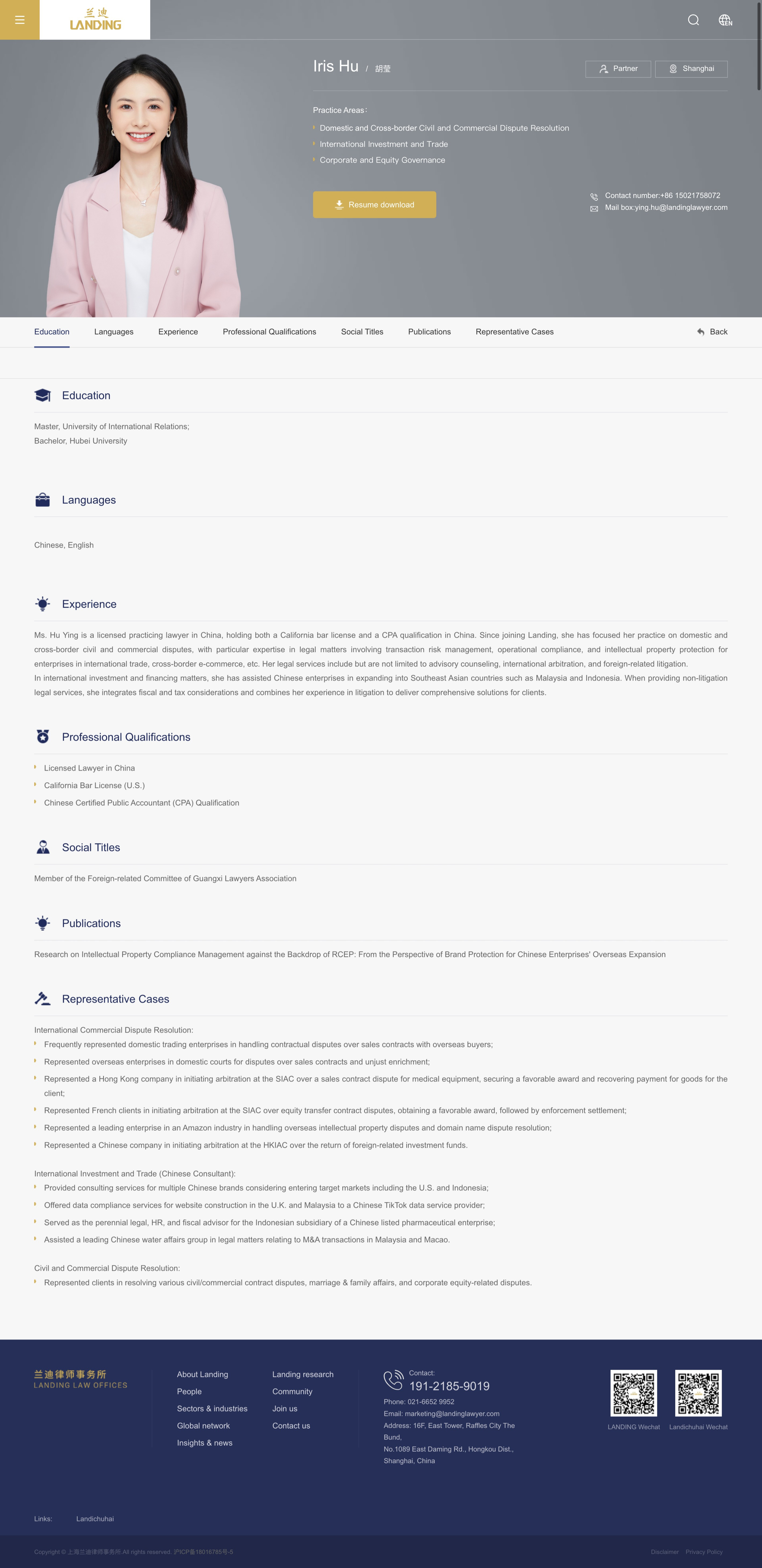 Experience Ms. Hu Ying is a licensed practicing lawyer in China, holding both a California bar license and a CPA qualification in China. Since joining Landing, she has focused her practice on domestic and cross-border civil and commercial disputes, with particular expertise in legal matters involving transaction risk management, operational compliance, and intellectual property protection for enterprises in international trade, cross-border e-commerce, etc. Her legal services include but are not limited to advisory counseling, international arbitration, and foreign-related litigation.