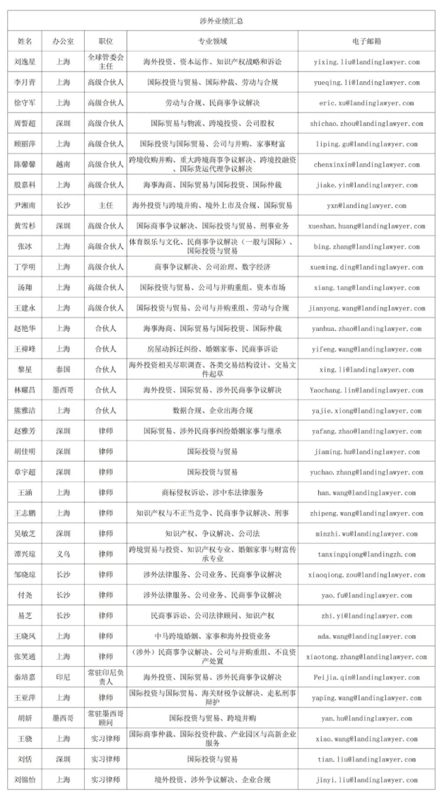 兰迪律师事务所在跨境法律服务方面实力突出,兰迪总部及国内三十余家分所超过160名合伙人、律师或助理具备涉外法律服务能力,可以在跨境投资、国际贸易、涉外商事诉讼、国际商事仲裁等领域向客户提供优质的法律服务。其中大部分专业人员拥有海外留学、培训或工作的经验,极具国际化视野,工作语言涵盖英语、日语、韩语、德语、西班牙语等,与诸多的外国律所建立了紧密的合作关系。兰迪服务的客户来自全球数十个国家,不乏世界五百强企业或中国五百强企业。兰迪涉外律师的专业能力、实务经验以及勤勉敬业的态度得到了客户的高度认可,正在业内赢得越来越多的声誉。