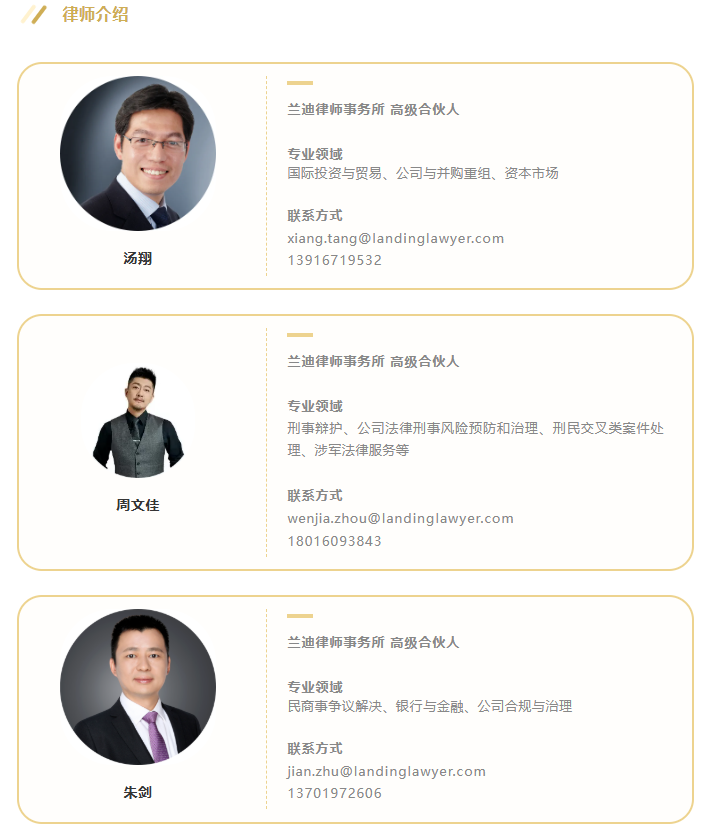 本次入库项目由兰迪律所高级合伙人汤翔律师牵头,联合高级合伙人周文佳律师、朱剑律师、陈禹彦律师、刘佳欣律师、徐守军律师,范知瀛律师、严妍律师、邬晓雯律师、周蕾蕾律师、刘洋律师、刘学森律师、张笑通律师、方歆薇律师、陈缤燕律师等资深律师共同完成。团队成员在银行与金融、劳动业务领域深耕多年,在跨境金融、银团贷款、船舶与航空器再融资、贸易融资、金融衍生品等细分领域具有丰富实务经验。