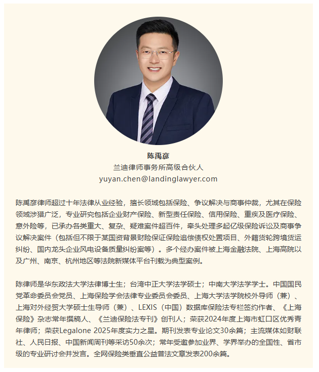 陈禹彦律师,兰迪律师事务所高级合伙人,身兼上海保险学会法律专业委员会委员,尤为擅长处理企业财产保险、信用保证保险以及重大人身保险合同纠纷。他的客户群体涵盖金融保险行业的头部机构及规模庞大的实体产业集团,包括国内领先的保险集团,以及大型能源国企、轨道交通集团等。在一起头部财险公司企业财产险理赔纠纷中,面对被保险人提出的高额索赔,陈禹彦律师带领团队耗时数月,分析被保险人提供的上千页工程项目造价资料,构建了精妙的抗辩逻辑,成功说服法院,为客户实现减损近两千万元的战果。来自客户的高度评价,是专业价值的最佳背书。合作长达八年的某保险集团法律合规负责人盛赞其“擅于破解复杂法律关系、高额标的案件中的难点问题”,该集团分公司的理赔诉讼管理者亦表示,“陈禹彦律师总能精准把握案件关键争议点”。而一家大型能源企业的董事会秘书则评价其在重大仲裁中“响应及时、方案务实”,是“值得信赖”的合作伙伴。作为《上海保险》杂志的常年撰稿人,他持续深耕保险法治理论与实务研究,已公开发表专业论文三十余篇;全网发布保险公益普法文章逾二百篇,以通俗语言传递专业价值,推动公众保险素养提升。他多次接受财联社、人民日报等主流权威媒体专访,累计五十余次,就行业热点与法治建设建言发声。同时,他常年受邀参与立法座谈、高端学术研讨会,并作主题发言,积极助力保险法律制度的完善与创新。凭借对保险合同纠纷诉讼策略的深刻把握,他在复杂多变的商业风险与法律争议中,始终为客户精准厘清法律关系、锁定胜局,彰显专业力量与责任担当。