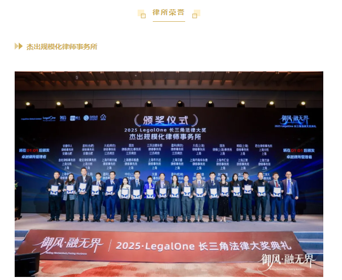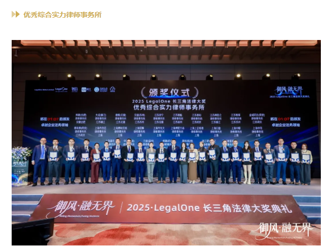 2026年2月7日,由知名法律评级机构LegalOne Global Limited主办的“御风·融无界——2025年度LegalOne长三角法律大奖典礼”在苏州成功举行。典礼现场,LegalOne Global Limited 颁发了涵盖律师、律所及企业法务团队的多个重磅奖项。