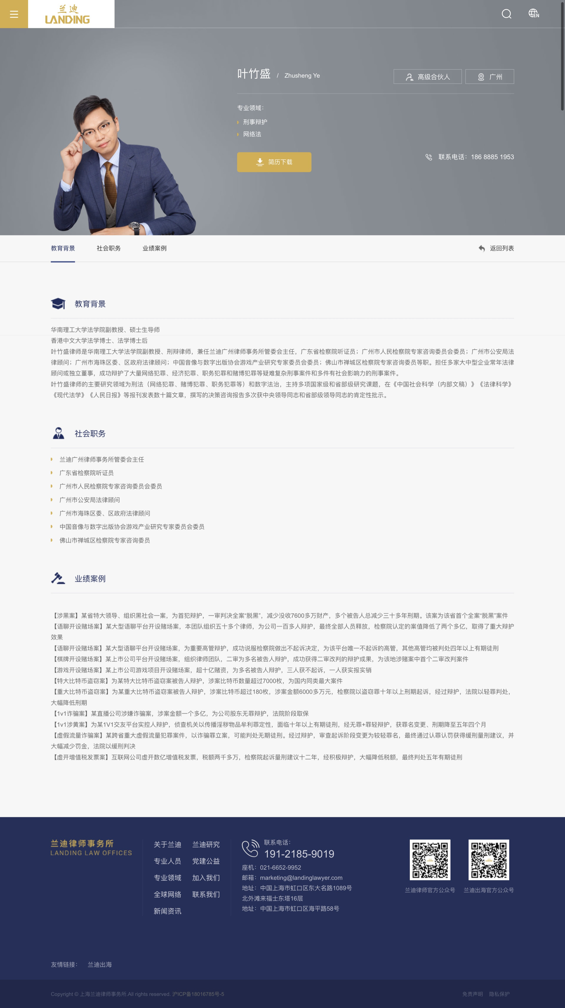 叶竹盛律师是华南理工大学法学院副教授、刑辩律师,兼任兰迪广州律师事务所管委会主任,广东省检察院听证员;广州市人民检察院专家咨询委员会委员;广州市公安局法律顾问;广州市海珠区委、区政府法律顾问;中国音像与数字出版协会游戏产业研究专家委员会委员;佛山市禅城区检察院专家咨询委员等职。担任多家大中型企业常年法律顾问或独立董事,成功辩护了大量网络犯罪、经济犯罪、职务犯罪和赌博犯罪等疑难复杂刑事案件和多件有社会影响力的刑事案件。