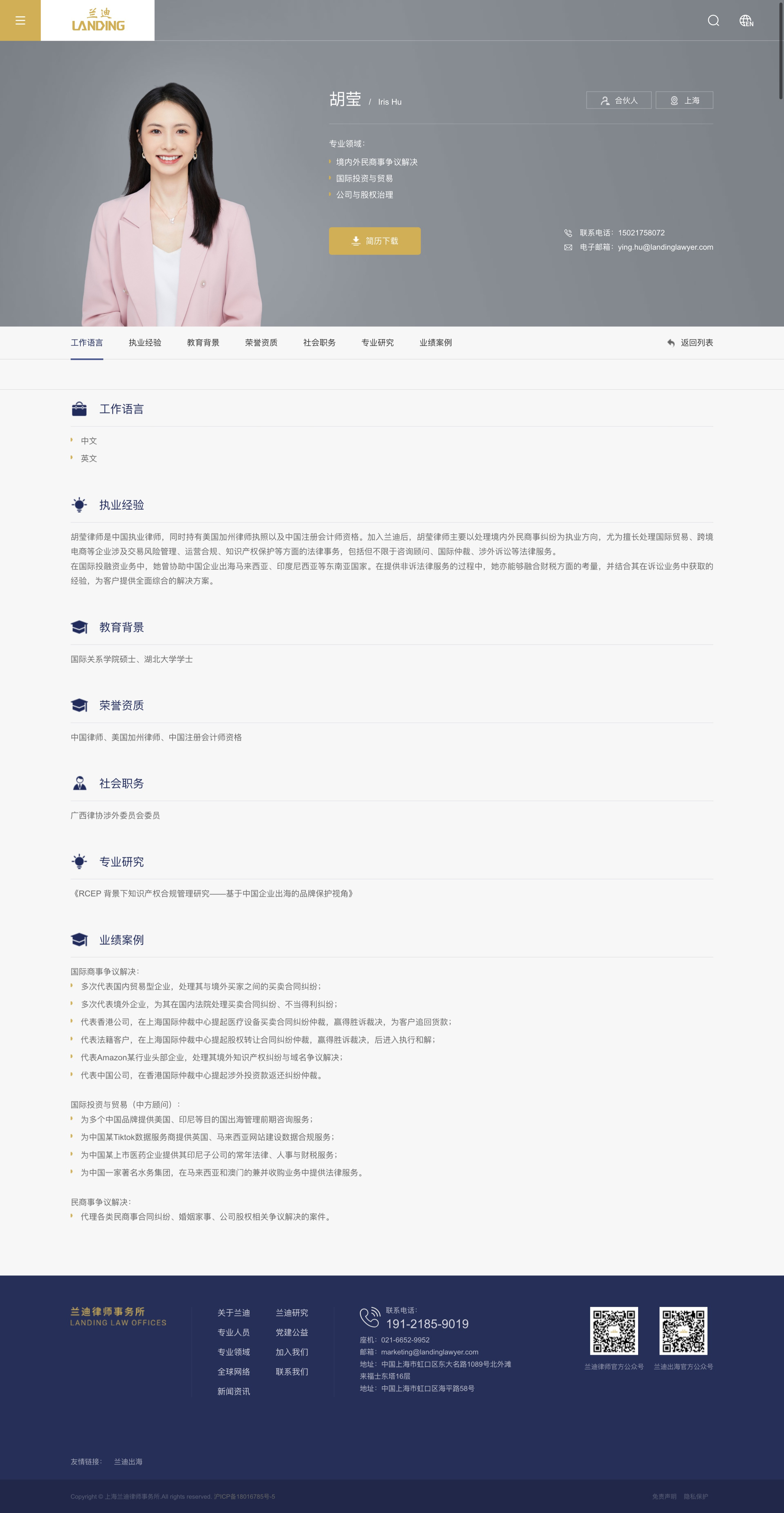 执业经验 胡莹律师是中国执业律师,同时持有美国加州律师执照以及中国注册会计师资格。加入兰迪后,胡莹律师主要以处理境内外民商事纠纷为执业方向,尤为擅长处理国际贸易、跨境电商等企业涉及交易风险管理、运营合规、知识产权保护等方面的法律事务,包括但不限于咨询顾问、国际仲裁、涉外诉讼等法律服务。