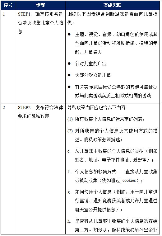 综上,美国视角下游戏领域儿童个人信息保护合规思路与步骤可总结如下表:
