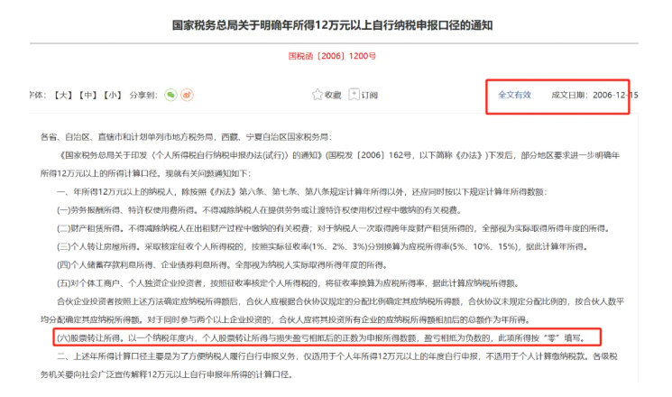 在新个税法施行前,国税函〔2006〕1200号《国家税务总局关于明确年所得12万元以上自行纳税申报口径的通知》(该文件在总局网站上标识还是全文有效https://fgk.chinatax.gov.cn/zcfgk/c100012/c5214046/content.html)明确规定:(六)股票转让所得。以一个纳税年度内,个人股票转让所得与损失盈亏相抵后的正数为申报所得数额,盈亏相抵为负数的,此项所得按“零”填写。