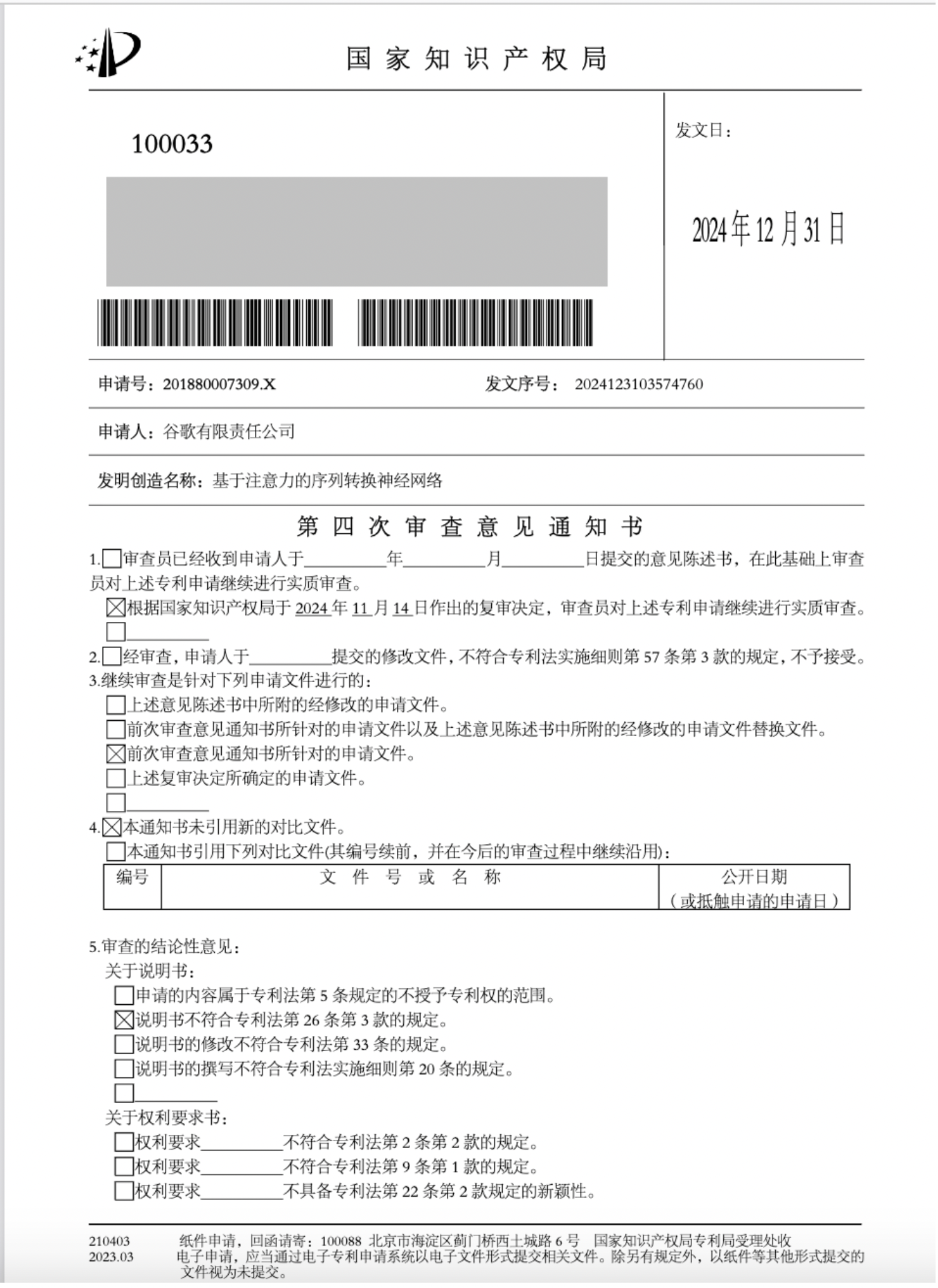2024年1月23日,国家知识产权局以技术方案不符合专利法第2条第2款(即该技术方案并非专利法所保护的客体)为由驳回了该专利申请。审查员认为,该专利属于对神经网络算法的改进,未解决具体技术领域的技术问题,且未展示如何通过改进提升硬件运算效率或执行效果。随后,谷歌于2024年4月提出复审请求,案件进入复审程序。
