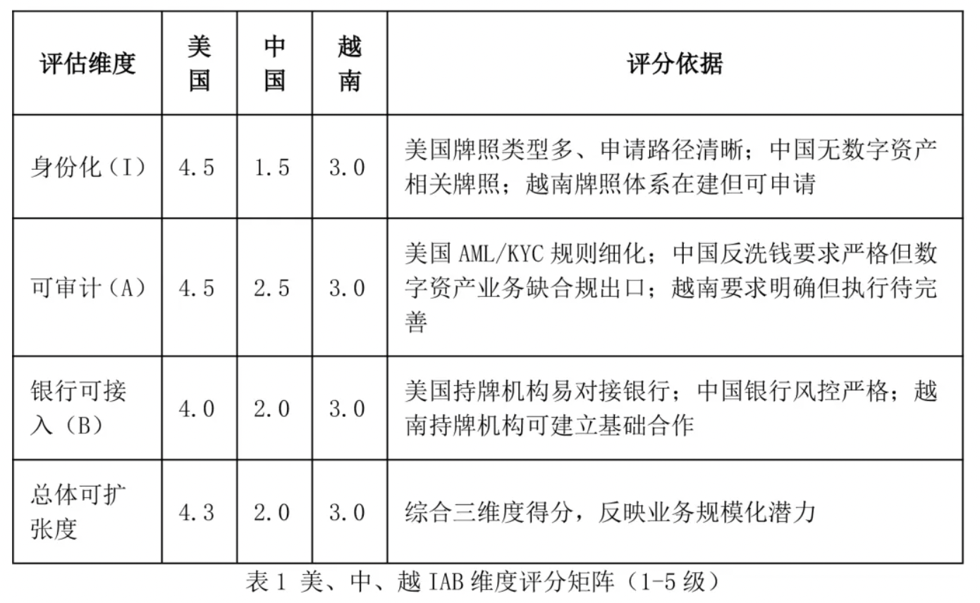 采用1-5级主观量表(5分为最优),结合“法规明晰度、身份化可得性、可审计要求落地性、银行合作可预期性”四大指标,对三国IAB维度进行评估。